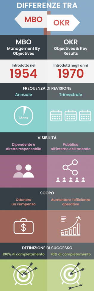 Il metodo OKR (Objective & Key Results) propone una visione innovativa rispetto al più tradizionale metodo MBO, (Management by Objective). Il metodo MBO è incentrato sulla definizione e gestione degli obiettivi, collegati a risultati di budget individuali. Al contrario, il metodo OKR è un processo di impostazione degli obiettivi, fondato sul principio dell’autodeterminazione, composto da 2 elementi: gli obiettivi e i risultati chiave, in grado di creare allineamento e coinvolgimento in tutta l’organizzazione, dai vertici fino al singolo dipendente.